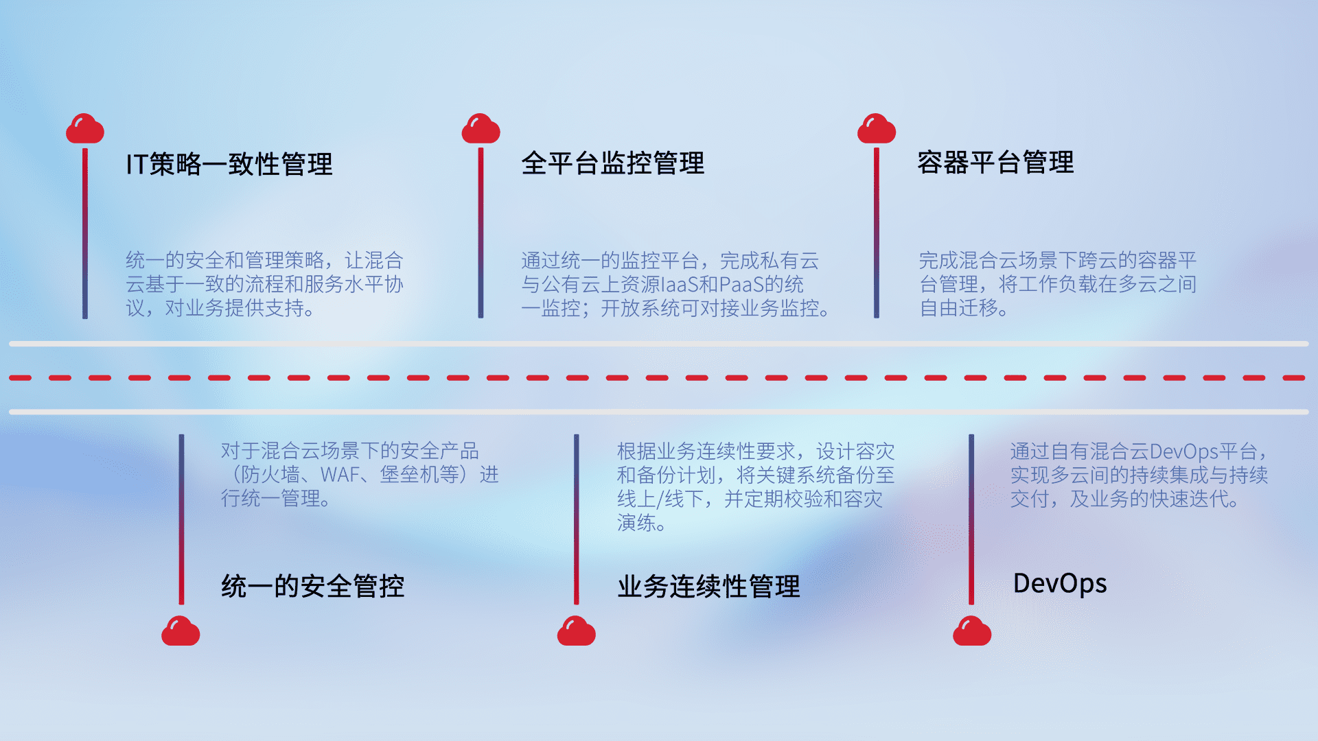 通过多云纳管,,以统一的资源数据模型把客户的云资源进行抽象和封装,,,进而实现对多云资源的统一操作,,保障云资源管理的可靠性、、、稳定性与可用性。。。量身定制化运维内容,,,,配置、、开发运维、、补丁管理、、备份、、、、监控、、、认证和访问管理、、审计和日常巡检等,,保障在用云过程中的可靠度,,,稳定度以及高可用率。。