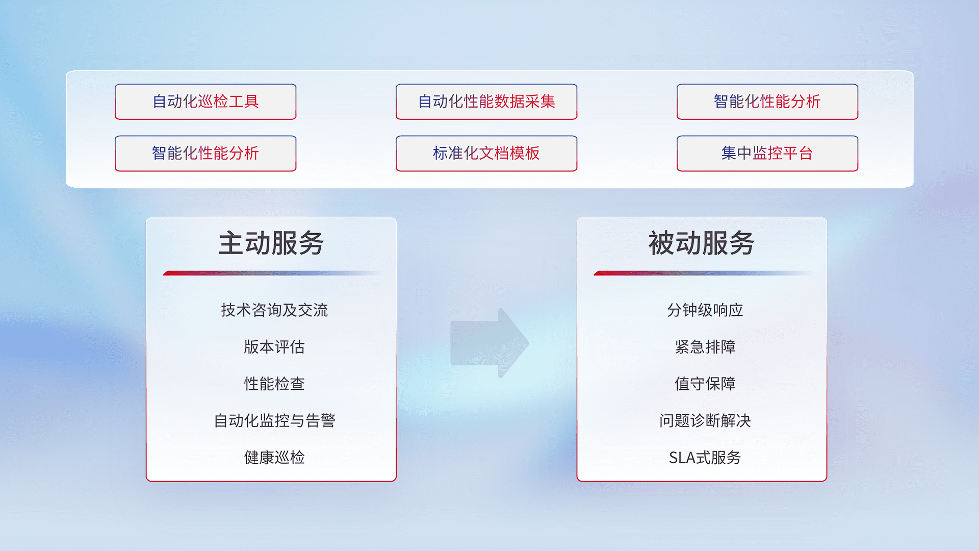 智能化工具和标准化文档,,,,保障服务质量,,提供主动服务(包含技术咨询、、版本评估、、、性能检查、、、、自动化监控与告警、、、、健康巡检)和被动服务包含(分钟级响应、、、紧急排障、、值守保障、、、、问题诊断解决、、、SLA服务)。。。。
